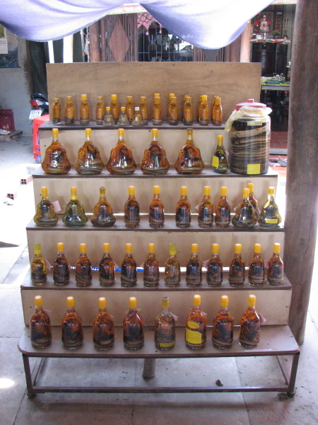 Sehr sehr eklig. In den Flaschen ist jeweils eine eingelegte Schlange, die auch