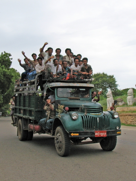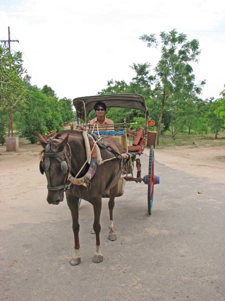 Sowas wie Taxis gibt es in Bagan so gut wie nicht. Schon vom Flughafen zum Hotel mussten wir im Gepäckwagen eines Reiseveranstalters mitfahren, da es am Flughafen kein Taxis gab. Am ersten Tag haben wir dann die Pagoden per Fahrrad erkundet, für den zweiten haben wir uns eine Kutsche mit Fahrer gemietet. Unser Fahrer war ein sehr faszinierender Kerl; er erzählte uns, dass er gerade Philosophie studiert, und auf die Frage Warum, sagte er einfach: "I like thinking". Das ist doch mal was, oder? ;-)