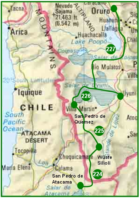 über den Salar de Uyuni wieder in Richtung La Paz gefahren.- 224. Tag: Von San Pedro de Atacama in die Wüste Silioli (ca. 215 km)