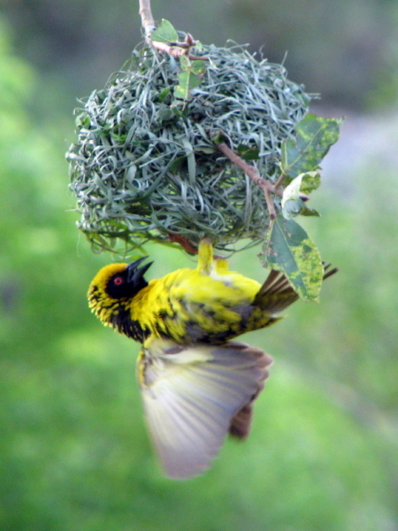 Webervögel sind sehr umtriebige Vögel. Sie bauen kugelförmige